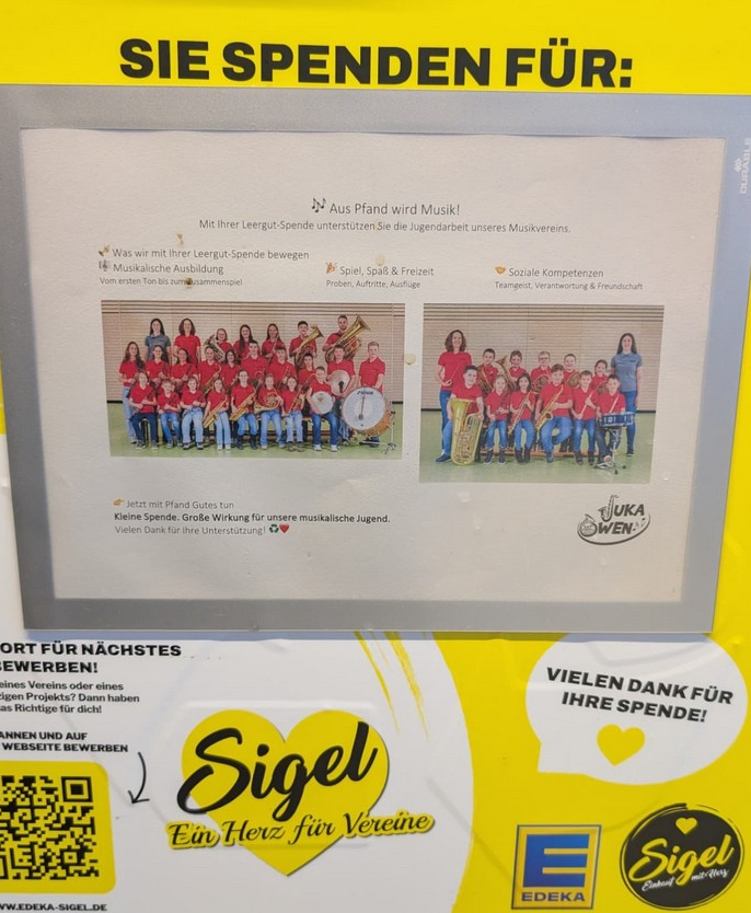 Wir bedanken uns ganz herzlich bei EDEKA Sigel für diese tolle Möglichkeit, unsere Jugend­ka­pelle zu unter­stützen und bitten unsere Mitglieder, Freunde der Owener Blasmusik und alle Bürger von dieser Möglichkeit der Unter­stützung gebrauch zu machen, damit aus Pfand Musik wird.