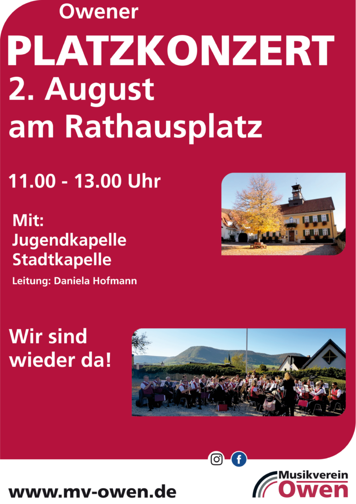 Das Platzkonzert findet im Freien statt und ist stark wetterabhängig. Wir entscheiden am Sonntagmorgen (2.8.20), ob es stattfinden wird oder nicht. Wir werden eine mögliche Absage hier veröffentlichen.