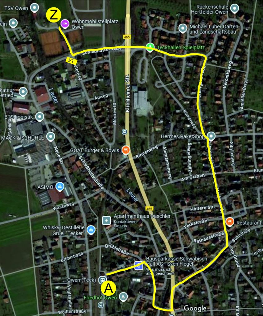 führt von der Aufstellung “A” (Eisenbahstr. und Bahnhofstr.) durch die Amtstraße ein kurzes Stück über die B465, die Steigstraße, Steingaustraße und Bergstraße zum Festplatz “Z”
